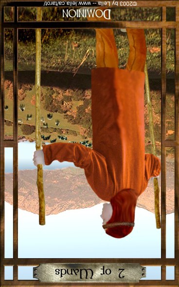 The 2 of Wands represents the research and digestion of a new idea. The number of this card and it's element are somewhat in conflict; while the 2 is focussed inwards, the Wand's element fire is outgoing. Fire wants to steam ahead while the blackbox 2 asks for patience.