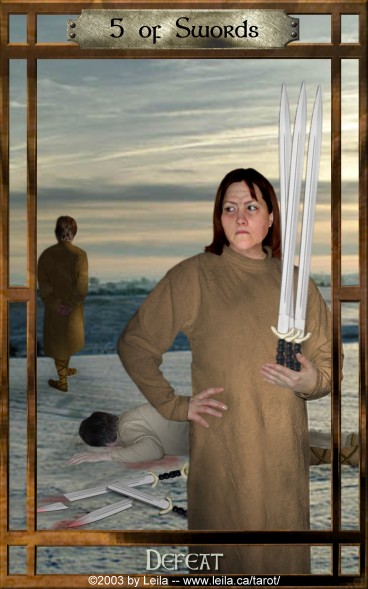 The 5 of Swords is about facing reality. The 5 is an assignment number, and in the slighly more difficult suit of Swords, it means you face a difficult challenge where your past experiences could hold you down.