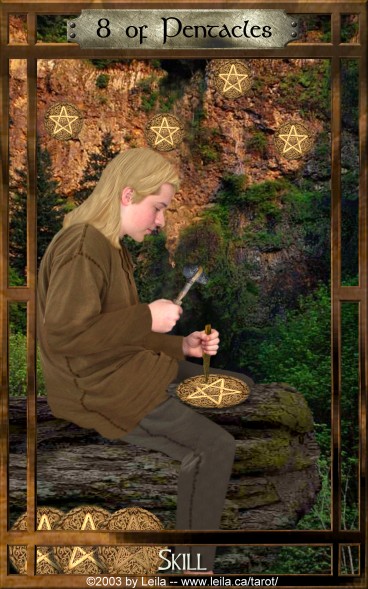 The 8 of Pentacles is about keeping up the hard work you're doing, and trying to be happy about doing that work at the same time. While the 3 of Pentacles is about completing a masterpiece, the 8 of Pentacles is about doing the apprentice work that makes you a master of your trade.
