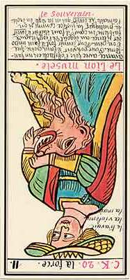 This card carries the number 11. In the Rider-Waite deck, Strength and Justice have swapped places because Waite saw links with the astrological signs Leo and Libra.