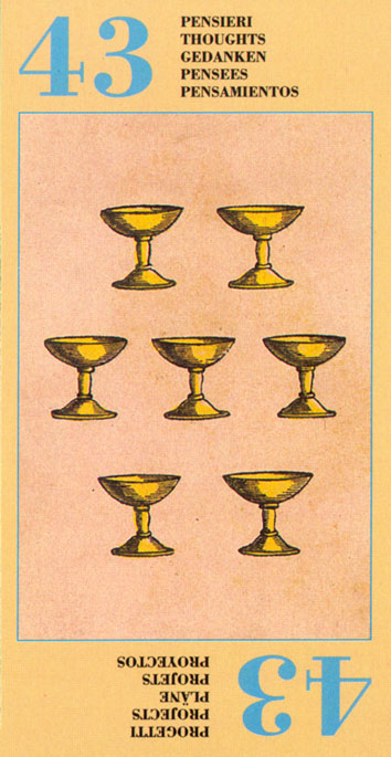 The 7 of Cups is about making a choice between different ideals. But Cups, with the water element, don't like making definitive choices that much, making this 7 in this suit a bit of a hard choice.