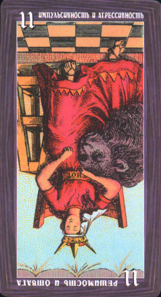 This card carries the number 11. In the Rider-Waite deck, Strength and Justice have swapped places because Waite saw links with the astrological signs Leo and Libra.