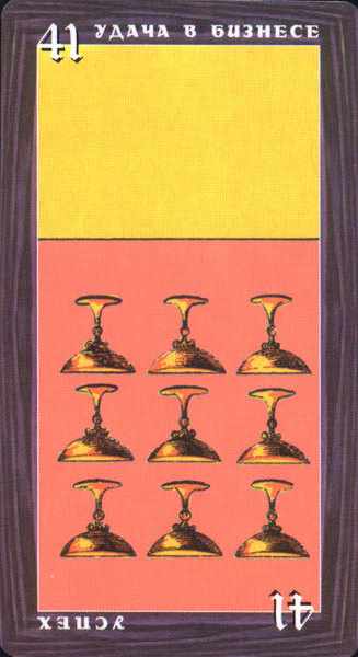 The 9 represents rest after work, which is another thing (like 8) that the element Fire associated with Wands is not very comfortable with. Fire likes to keep going. This rest will probably be spent thinking about what to do next along the course to completion.
