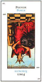 This card carries the number 11. In the Rider-Waite deck, Strength and Justice have swapped places because Waite saw links with the astrological signs Leo and Libra.