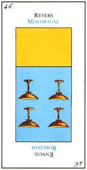 With the 4, the second cycle of this suit is commenced, where a choice between structure and feeling has to be made, where old securities have to be let go of to work towards a new future. But like Wands, Cups don't like structure much, they prefer to be free and dream rather than to make commitments and go for something.