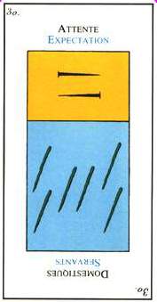 The 9 represents rest after work, which is another thing (like 8) that the element Fire associated with Wands is not very comfortable with. Fire likes to keep going. This rest will probably be spent thinking about what to do next along the course to completion.