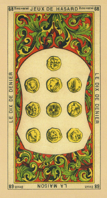 The 10 of Pentacles represents material posessions. The number 10 of Pentacles forms the links to the Ace (first card) of Wands (the first suit in the minor Arcana), and thus prepares to bring you back to the beginning of the minor Arcana, ready for a next cycle through the tarot.