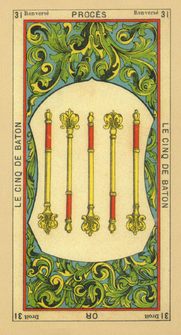 The 9 represents rest after work, which is another thing (like 8) that the element Fire associated with Wands is not very comfortable with. Fire likes to keep going. This rest will probably be spent thinking about what to do next along the course to completion.