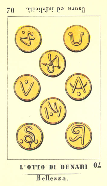 The 8 of Pentacles is about keeping up the hard work you're doing, and trying to be happy about doing that work at the same time. While the 3 of Pentacles is about completing a masterpiece, the 8 of Pentacles is about doing the apprentice work that makes you a master of your trade.