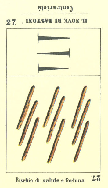 The 9 represents rest after work, which is another thing (like 8) that the element Fire associated with Wands is not very comfortable with. Fire likes to keep going. This rest will probably be spent thinking about what to do next along the course to completion.