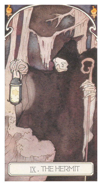 The Hermit carries the number 9. This is the highest base number. After 9 the composed numbers emerge. Therefore the number 9 is the gateway to a higher order. It is also a place to rest before embarking on the next leg of the journey.