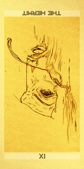 The Hermit shuts out the world and retreats into solitude to better understand some spiritual aspect of life. He opens to the cosmos and lets it's wisdom sink in. Hermits are often seen as wise old men who can guide a traveller along a journey.