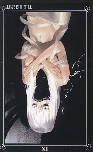 The Hermit shuts out the world and retreats into solitude to better understand some spiritual aspect of life. He opens to the cosmos and lets it's wisdom sink in. Hermits are often seen as wise old men who can guide a traveller along a journey.
