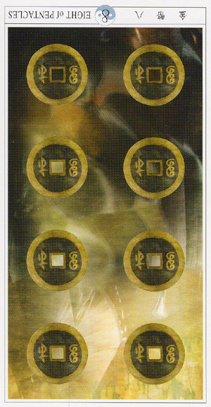 The 8 of Pentacles is about keeping up the hard work you're doing, and trying to be happy about doing that work at the same time. While the 3 of Pentacles is about completing a masterpiece, the 8 of Pentacles is about doing the apprentice work that makes you a master of your trade.