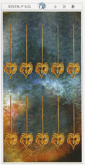 The 10 of Wands is therefore the transition from the element Fire (associated with Wands) to the element Water, associated with Cups. As you might imagine, this not the easiest of transitions.