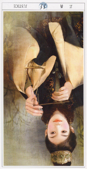 This card carries the number 11. In the Rider-Waite deck, Strength and Justice have swapped places because Waite saw links with the astrological signs Leo and Libra.