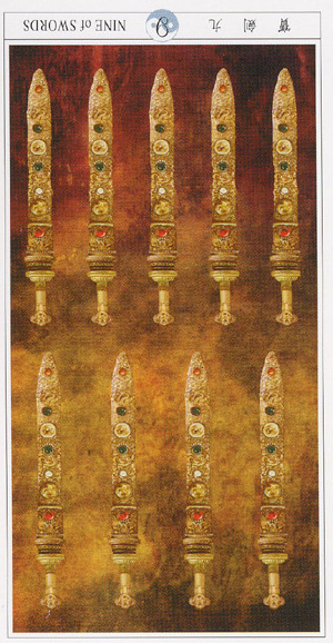 The 9 of Swords represents relief from cropped-up grief. The number 9 is a number of reward and rest and accomplishment. In the element of Swords there is not a lot of time for rest, but without any rest you'd just burn yourself out.