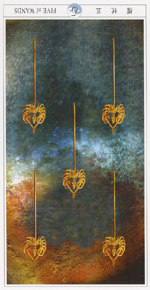 The 5 of Wands represents competition. The 5 is the second assignment number, and therefore a difficult card. 5 combined with the Wand's element fire challenges you. You'll have to fight hard for your idea, but you stand a good chance of succeeding.