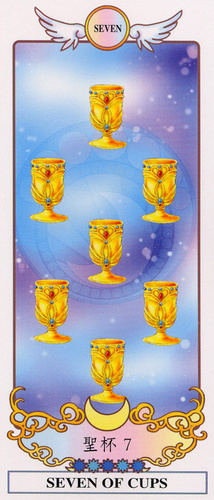 The 7 of Cups is about making a choice between different ideals. But Cups, with the water element, don't like making definitive choices that much, making this 7 in this suit a bit of a hard choice.
