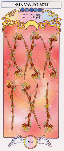 The 10 of Wands is therefore the transition from the element Fire (associated with Wands) to the element Water, associated with Cups. As you might imagine, this not the easiest of transitions.