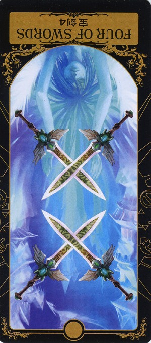 4 is the first number in the cycle of giving things shape. It's about making things real. The element of Swords also relates to making things real, so this enhances the effect so much that arrogance can cause you to exhaust yourself.