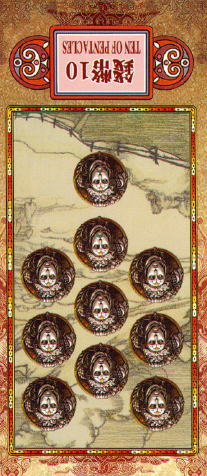 The 10 of Pentacles represents material posessions. The number 10 of Pentacles forms the links to the Ace (first card) of Wands (the first suit in the minor Arcana), and thus prepares to bring you back to the beginning of the minor Arcana, ready for a next cycle through the tarot.