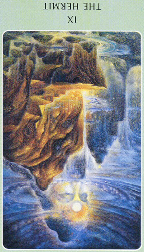 The Hermit shuts out the world and retreats into solitude to better understand some spiritual aspect of life. He opens to the cosmos and lets it's wisdom sink in. Hermits are often seen as wise old men who can guide a traveller along a journey.