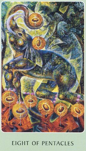 The 8 of Pentacles is about keeping up the hard work you're doing, and trying to be happy about doing that work at the same time. While the 3 of Pentacles is about completing a masterpiece, the 8 of Pentacles is about doing the apprentice work that makes you a master of your trade.