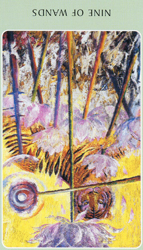 The 9 represents rest after work, which is another thing (like 8) that the element Fire associated with Wands is not very comfortable with. Fire likes to keep going. This rest will probably be spent thinking about what to do next along the course to completion.