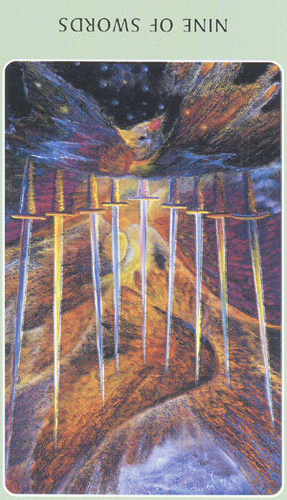 The 9 of Swords represents relief from cropped-up grief. The number 9 is a number of reward and rest and accomplishment. In the element of Swords there is not a lot of time for rest, but without any rest you'd just burn yourself out.