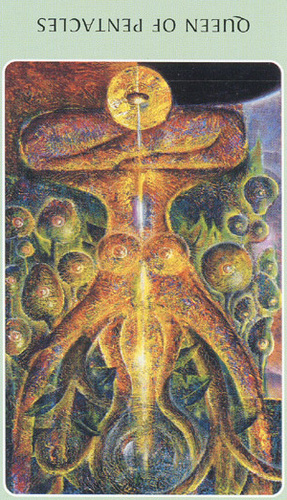 The Queen in the suit of Pentacles becomes aware of her Earthly attributes; she's reliable and sober, able to give good advice.