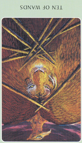 The 10 of Wands is therefore the transition from the element Fire (associated with Wands) to the element Water, associated with Cups. As you might imagine, this not the easiest of transitions.