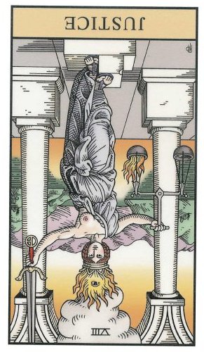 This card carries the number 11. In the Rider-Waite deck, Strength and Justice have swapped places because Waite saw links with the astrological signs Leo and Libra.