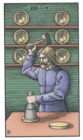 The 8 of Pentacles is about keeping up the hard work you're doing, and trying to be happy about doing that work at the same time. While the 3 of Pentacles is about completing a masterpiece, the 8 of Pentacles is about doing the apprentice work that makes you a master of your trade.