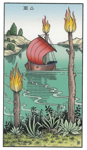 This card is about exposing your new ideas to the world. The Wand's element fire goes well with the number 3, as 3 is an output number, a number of results. Fire likes getting to results quickly.