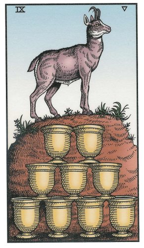 The 9 of Cups represents achievement and contentment. It is an excellent time to take some rest and enjoy yourself.
