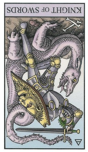 The Knight of Swords lacks the naivety of the Knight of Wands, he has analyzed the terrain ahead and weighed his options there. He knows what his own nature can throw into the mix, but does not let himself be held idle by that. The activities ahead will likely include the solving of conflicts and problems on your road to your ideal.