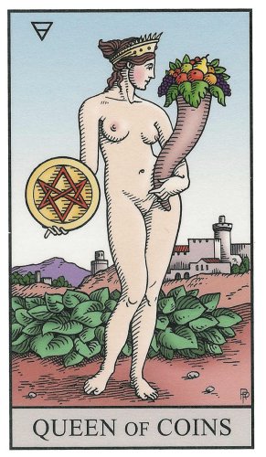 The Queen in the suit of Pentacles becomes aware of her Earthly attributes; she's reliable and sober, able to give good advice.