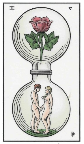 This the first assignment number of the Cups suit. Unlike Wands, with the Fire element, Cups, with the water element, has a lot more patience. Water is by nature more introspective, and this second card in the Cups suit is indeed about exploring yourself. The outcome is uncertain as always, but it usually results in better acceptance of yourself.