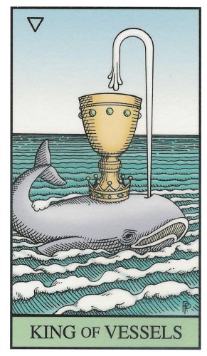 The King of Cups uses his intuition to achieve his ideals. Since Cups are turned inward, and Kings turned to the outside world, this card might be a difficult one, or it could be a powerful one.