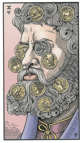 The 10 of Pentacles represents material posessions. The number 10 of Pentacles forms the links to the Ace (first card) of Wands (the first suit in the minor Arcana), and thus prepares to bring you back to the beginning of the minor Arcana, ready for a next cycle through the tarot.