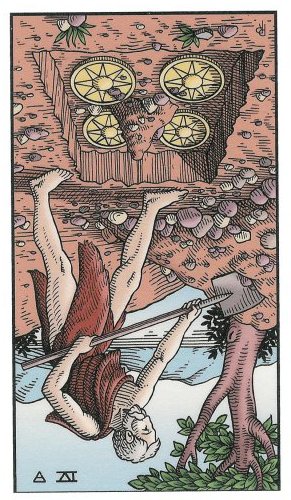 The 4 of Pentacles is about holding on to what you got. The number 4 represents structure and order, and fits well with the suit's element, Earth.
