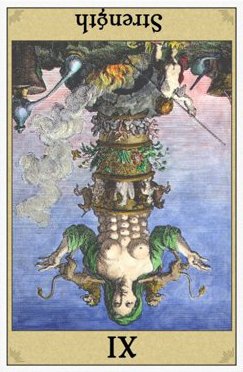 This card carries the number 11. In the Rider-Waite deck, Strength and Justice have swapped places because Waite saw links with the astrological signs Leo and Libra.