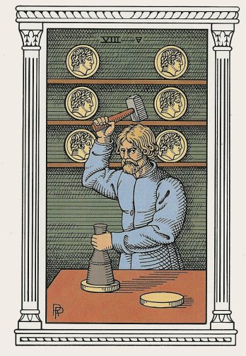 The 8 of Pentacles is about keeping up the hard work you're doing, and trying to be happy about doing that work at the same time. While the 3 of Pentacles is about completing a masterpiece, the 8 of Pentacles is about doing the apprentice work that makes you a master of your trade.