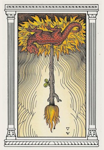 The ace of wands represents the beginning of an idea. The element fire and the number 1 give a powerful combination: enterprise and new beginnings apply to both. This is an energetic combination, which is why the card is generally considered a positive one. Spring is the season associated with this card.