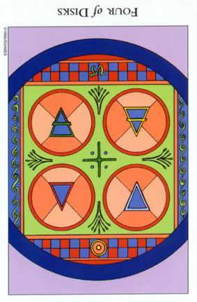 The 4 of Pentacles is about holding on to what you got. The number 4 represents structure and order, and fits well with the suit's element, Earth.