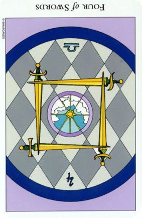 4 is the first number in the cycle of giving things shape. It's about making things real. The element of Swords also relates to making things real, so this enhances the effect so much that arrogance can cause you to exhaust yourself.