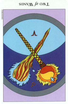 The 2 of Wands represents the research and digestion of a new idea. The number of this card and it's element are somewhat in conflict; while the 2 is focussed inwards, the Wand's element fire is outgoing. Fire wants to steam ahead while the blackbox 2 asks for patience.