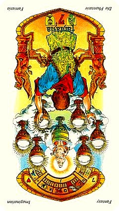The 7 of Cups is about making a choice between different ideals. But Cups, with the water element, don't like making definitive choices that much, making this 7 in this suit a bit of a hard choice.