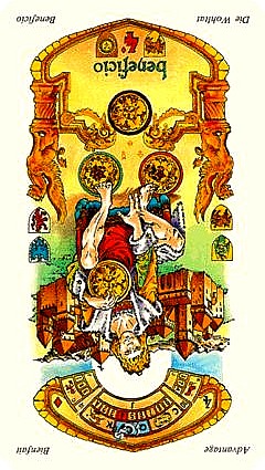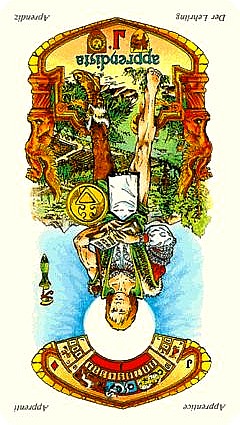 Pages explore and gather information about the road ahead, with an almost naive attitude. The Page of Pentacles is sometimes described as a bridge builder; Pentacles is the suit where the actual work is done, and the Page here enables those that follow to quickly cross difficult terrain.